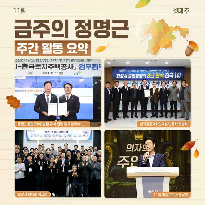 [화성=로컬라이프] 송준형 기자 = 정명근 화성시장은 23일, 자신의 페이스북을 통해 소설(小雪)이 지나고 차가워진 바람에 겨울이 다가왔음을 느끼는 한 주다. 특히 일교차가 큰 요즘, 감기 조심하시고 건강 유의하시길 바란다며, 금주의 정명근을 위 사진과 같이 전했다.