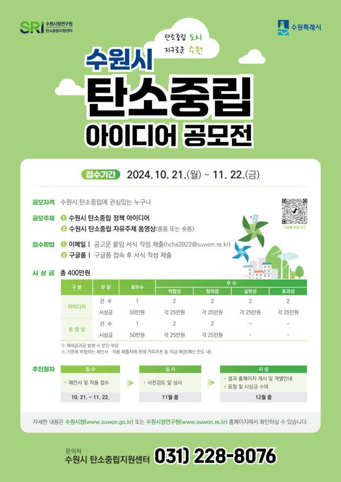 수원시 홈페이지(www.suwon.go.kr) ‘시정소식’ 게시판에서 ‘탄소중립 아이디어 공모전’을 검색해 신청 서식을 내려받아 작성 후 전자우편(hcha3922@suwon.re.kr)으로 제출하면 된다. 공모전 홍보물에 있는 큐알(QR)코드를 스마트폰으로 스캔해 구글 폼으로 제출해도 된다.