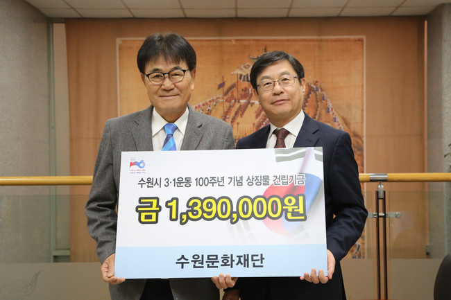 이날 전달식에는 수원문화재단 박래헌 대표이사와 수원시 3.1운동‧대한민국 임시정부수립 100주년 기념사업 추진위원회 김봉식 수석부위원장, 김준혁 집행위원장, 김영균 총괄간사 등이 참석한 가운데 수원문화재단에서 모금한 139만원의 기부금을 전달했다.