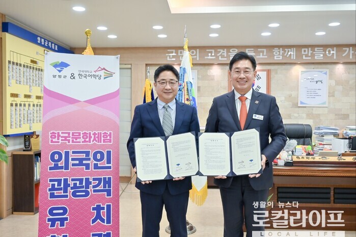 ▲ 전진선 양평군수(오른쪽)와 이석재 연세대학교 한국어학당원장(왼쪽)이 업무협약 체결 후 기념촬영을 하고 있다. (사진출처=전진선 페이스북) |