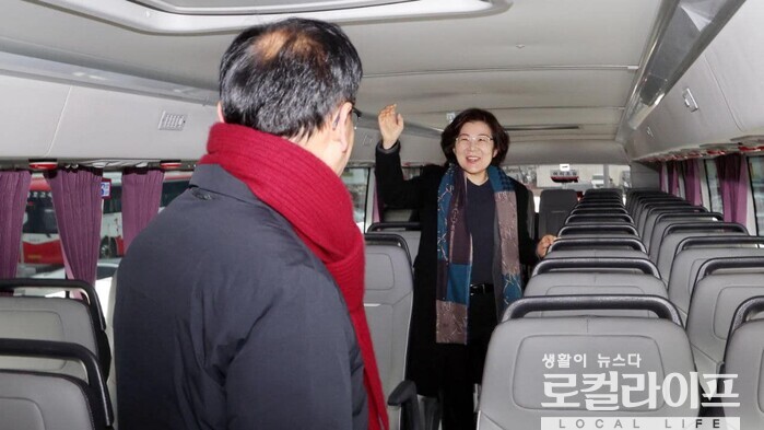 ▲ 김보라 안성시장이 동아방송대~강남역 간 운행되는 광역버스 4402번 개통을 맞아 점검하고 있다. (사진출처=김보라 페이스북) |