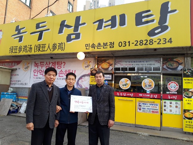 용인시 기흥구 상갈동은 12일 관내 식당‘이창노 녹두삼계탕 매기매운탕’을 이웃돕기 성금.품을 정기적으로 기부하는 지역상점인‘행복나눔가게’5호로 선정하고 현판을 전달했다.