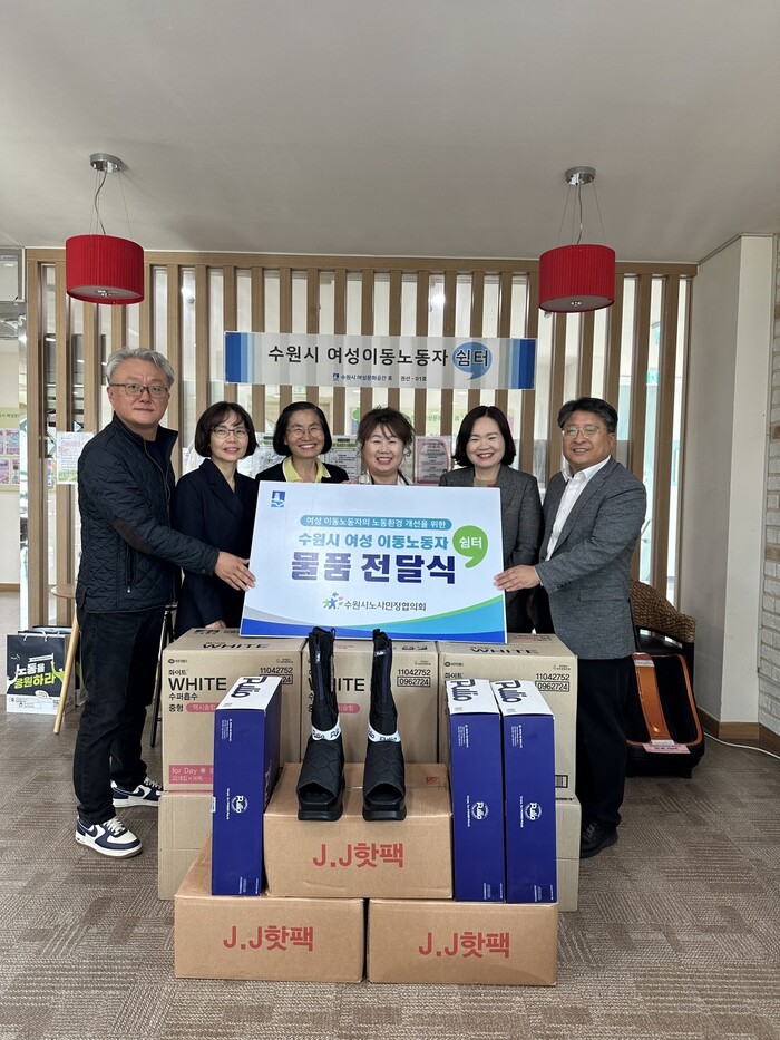 수원시 노사민정협의회가 13일 수원 여성이동노동자 쉼터 3개소에 발 마사지기 3개, 여성용품 4100여 개, 핫팩 2000여 개를 전달했다.