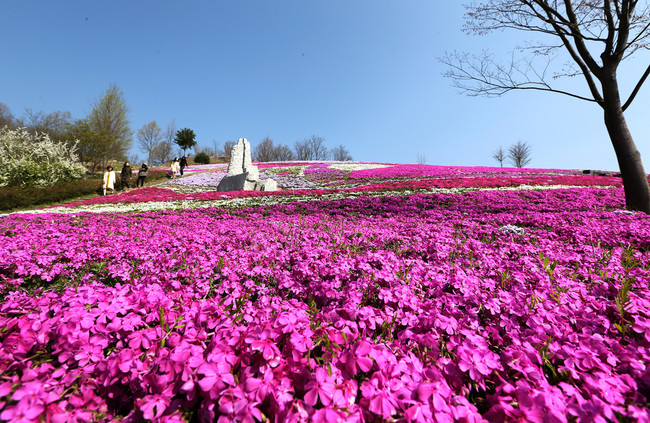 특히 공원 부지 2만5000㎡ 규모에는 화려한 꽃잔디가 만개가 펼쳐져 있어 분홍색 융단이 깔린 야외 미술관에 와 있는 듯한 이색적인 볼거리가 장관이다. 또한 둑길과 생초면 체육공원 1만㎡ 부지에도 올해 꽃잔디를 추가로 식재하고 도로변에도 홍도화를 심어 생초면 일원은 온통 꽃 천지가 될 전망이다.
