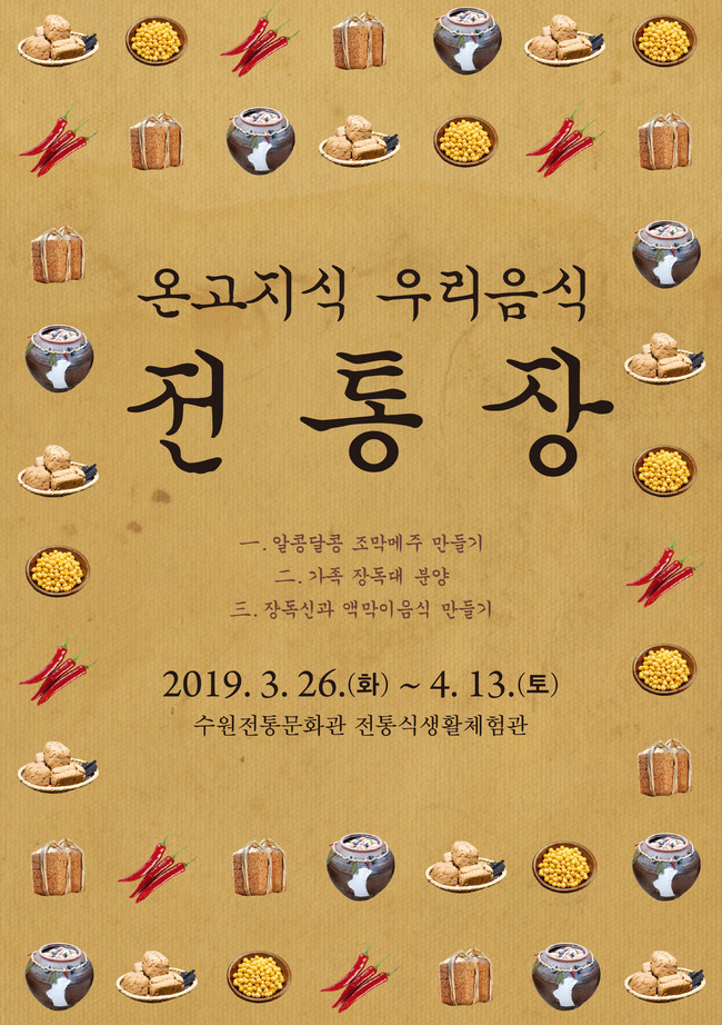 수원문화재단(대표이사 박래헌) 수원전통문화관에서 오는 3월과 4월에 걸쳐 전통장 체험 프로그램 ‘온고지식 우리음식, 전통장’을 선보인다.