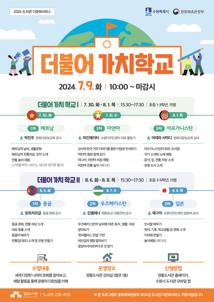 수원시 영통도서관이 어린이를 대상으로 하는 다문화프로그램인 ‘더불어 가치학교’의 수강생을 모집한다.