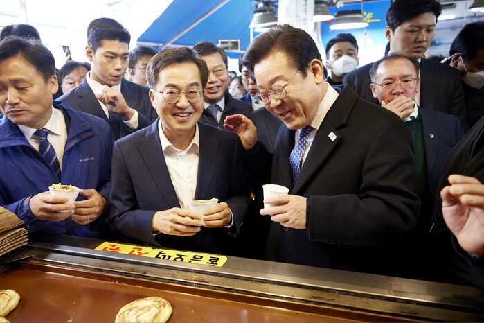김동연 경기도지사가 21일 이재명 더불어민주당 대표를 비롯한 민주당 국회의원들과 전통시장을 찾아 소상공인의 목소리를 듣고 지역사랑상품권(지역화폐) 예산 반영 의지를 밝혔다.