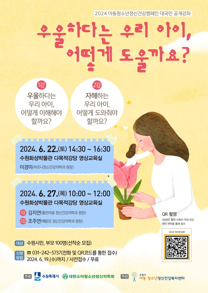 수원시(시장 이재준)는 6월 22일 오후 2시 30분, 27일 오전 10시 2회에 걸쳐 수원화성박물관 다목적강당에서 아동·청소년의 우울·자해를 주제로 2024 아동·청소년정신건강캠페인 대국민 공개강좌를 연다.