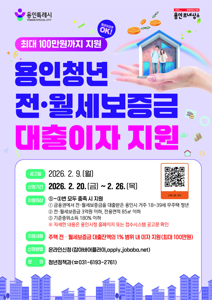 용인특례시(시장 이상일)는 청년층의 주거비 부담을 덜고자 전월세 보증금 대출이자를 지원한다고 6일 밝혔다.