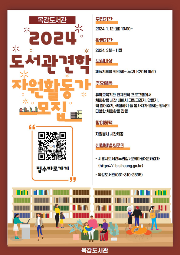 시흥시(시장 임병택) 목감도서관은 ‘2024년 견학프로그램을 함께 운영할 자원활동가’를 모집한다.