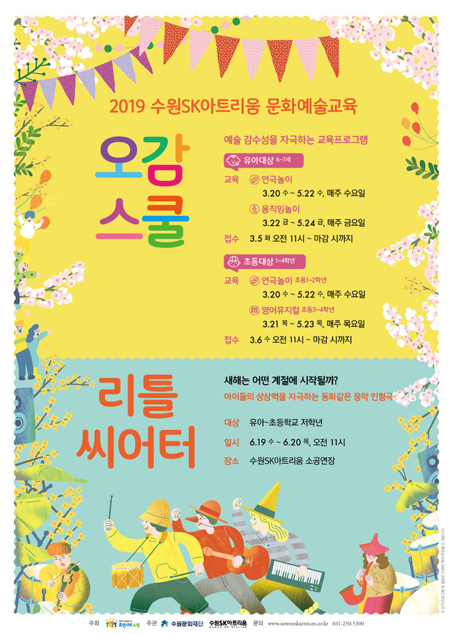 오감스쿨은 3월 5일(화), 3월 6일(수) 11시부터 접수 마감 시까지 수원SK아트리움 홈페이지를 통해 접수받는다. 수강료는 유아 대상 교육프로그램은 70,000원, 초등학생 대상 교육프로그램은 100,000원이다.