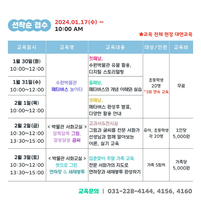 1월 31일부터 2월 3일까지 총 7회에 걸쳐 오전과 오후 대상별 교육으로 진행된다. 수원박물관 홈페이지(https://swmuseum.suwon.go.kr) ‘통합예약시스템’에서 1월 17일 오전 10시부터 선착순으로 신청할 수 있다.