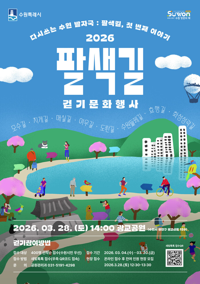 수원특례시(시장 이재준)가 ‘2026 팔색길 걷기 문화행사’에 참여할 시민 400명을 3월 20일까지 선착순으로 모집한다.