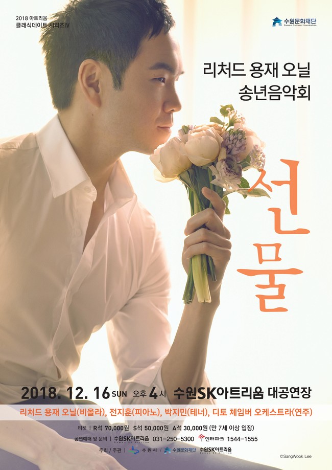 리처드 용재 오닐 송년음악회 <선물>은 2018년 12월 16일(일) 오후 4시 수원SK아트리움 대공연장에서 진행되며 입장가능연령은 8세 이상이다. 초·중·고·대학생은 학생할인 30%, 수원SK아트리움 카카오플러스 친구는 20%를 할인해주고 있다.
