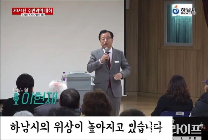 ▲ 이현재 하남시장이 ‘주민과의 대화’를 진행하고 있다. (사진출처=이현재 페이스북 영상 갈무리) |