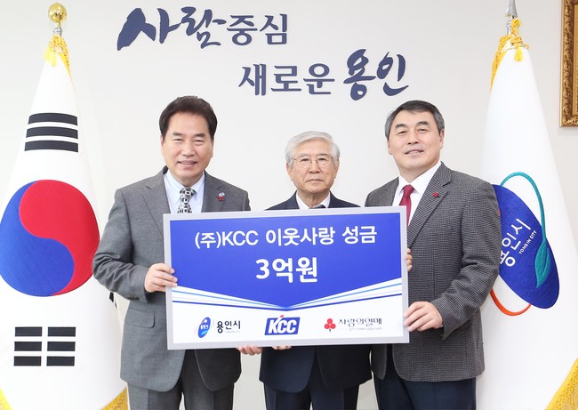 용인시는 15일 ㈜KCC중앙연구소 이정대 소장과 임직원 등 3명이 백군기 시장실을 방문해 이웃돕기 운동인 ‘사랑의 열차 이어달리기’에 성금 3억원을 기탁했다고 밝혔다.
