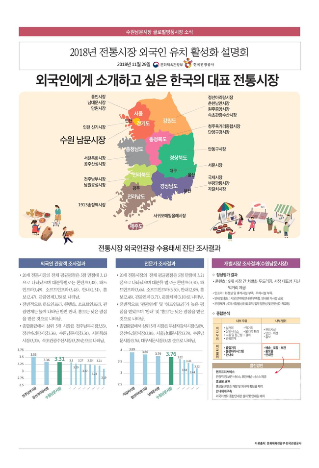 수원남문시장은 조사 대상인 한국관광공사 선정 2018년 대표 전통시장 22개소 중 외국인 관광객 조사 결과에서 3위, 전문가 조사 결과에서 4위의 성적을 거둬 두각을 나타냈다.