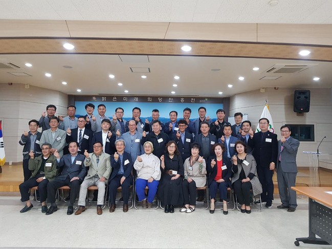 (사)이웃, 봉사단체가 월례회의를 마치고 함께하는 우리 행복한 이웃의 슬로건으로 기념촬영을 하고 있다. /사진제공=홍천군청