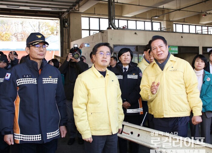 ▲ 최대호 안양시장(오른쪽 민방위복)이 김동연 경기도지사(왼쪽 민방위복)와 폭설 피해를 입은 안양농수산물도매시장을 방문해 피해 상인들을 위로하고 있다. (사진출처=최대호 페이스북) |