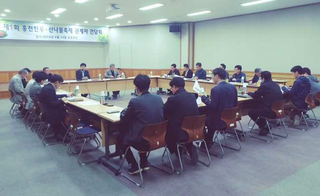 (재)홍천문화재단(이사장 허필홍, 대표이사 전명준)은 2019. 4. 18.(목) 14:00 홍천문화예술회관 2층 강당에서 제1회 홍천한우·산나물축제 대표자 간담회를 개최했다.