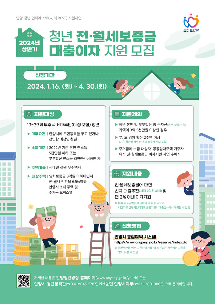 안양시는 목돈 마련이 어려운 무주택 청년층을 대상으로 ‘2024년 상반기 청년 전·월세 보증금 대출이자 지원’ 사업 대상자를 모집한다고 15일 밝혔다.