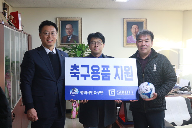 평택시민축구단은 1월 3일 단국대학교 학생처장 김기홍 교수, 단국대학교 학생처 고준규 팀장, 평택시민축구단 한광민 사무국장이 참석한 가운데 축구공 등 축구용품을 지원하는 전달식을 진행했다.