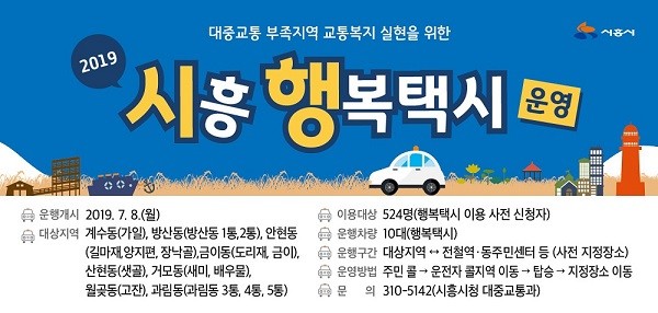 시흥시 행복택시 이용대상은 ‘국토부에서 인정한 대중교통 부족 지역’인 계수동, 방산동, 안현동, 금이동, 산현동, 거모동, 월곶동, 과림동 주민과 통학차량이 없어 불편을 겪고 있는 온신초등학교 학생이다. 앞으로 이 지역 대상주민은 시에서 지정한 행복택시 10대를 이용해 목적지로 편리하게 이동할 수 있게 됐다.