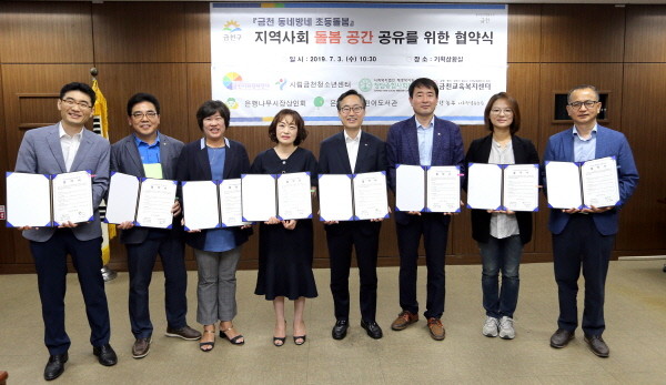 이번 협약에는 지역공동체, 사회적협동조합 금천사회적경제연대, 금천청소년센터, 청담종합사회복지관, 금천교육복지센터, 은행나무시장상인회, 은행나무어린이도서관, 건강한 농부 사회적협동조합이 함께했다.