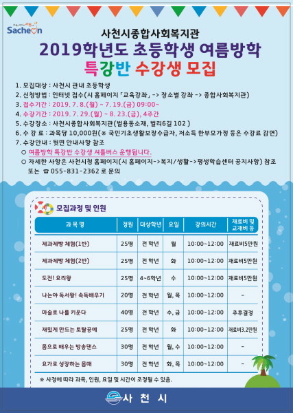 사천시종합사회복지관, 초등학생 여름방학 특강반 수강생 모집 안내문