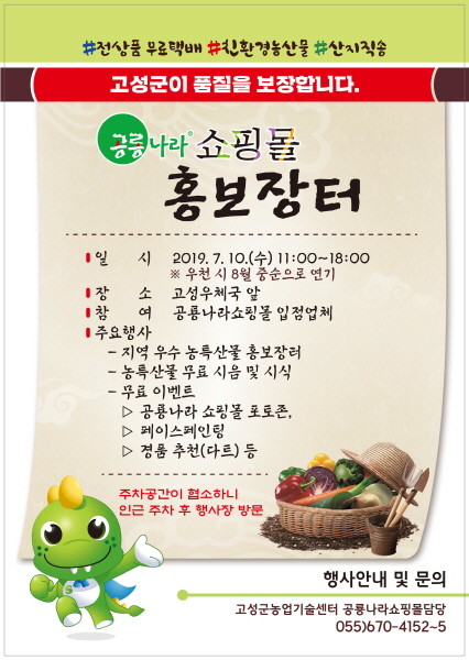 고성군은 오는 10일 오전 11시부터 오후 6시까지 고성우체국 앞 에서 공룡나라쇼핑몰 홍보장터를 개최한다.