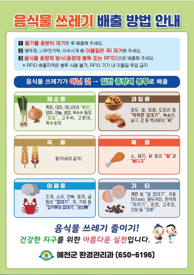 특히, 재활용품은 종류별로 구분해 품목별 배출 방법에 맞게 배출해야하고, 음식물 쓰레기는 물기 및 이물질을 제거한 후 음식물 종량제 봉투에 담아 배출해야 하며, 일부 공동주택은 RFID 배출 방법으로 배출해야 한다.