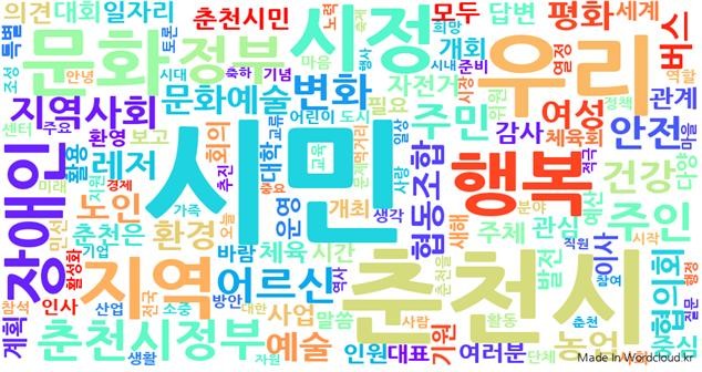 춘천시정부는 출범 1주년을 맞아 2018년 7월부터 5월까지 축사와 환영사, 송년사, 신년사, 인터뷰 등 488건의 인사말씀을 행안부 빅데이터 공통기반 플랫폼인‘혜안’을 이용해 분석했다.