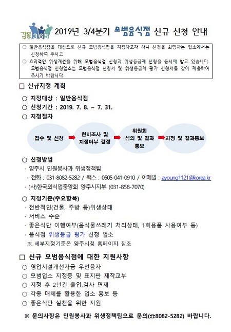 신청은 양주시청 홈페이지에서 신청서를 내려 받아 양주시청 위생정책팀이나 한국외식업중앙회 양주시지부에 제출하면 된다.