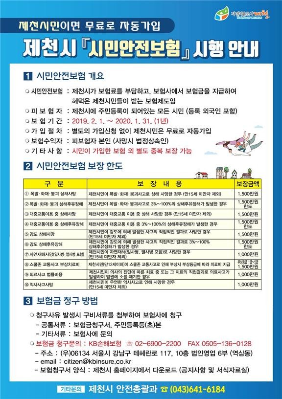 제천시가 가입한 시민안전보험은 개인이 가입한 보험 외 중복보장이 가능하며, 신규로 제천시에 전입한 주민도 자동 가입이 되고, 타 지역에서 발생한 사고여도 제천시에 주소를 두고 있는 시민이라면 보장혜택을 받을 수 있다.