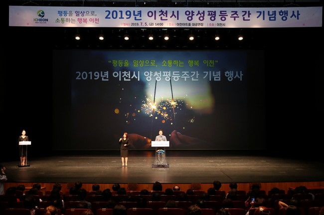 이천시는 지난 5일 ‘평등을 일상으로, 소통하는 행복 이천’이라는 주제로 우리 사회 모든 영역에서 성차별을 개선하고 실질적인 양성평등 사회 실현을 촉진하기 위한 2019년 이천시 양성평등주간 기념행사를 성황리에 마쳤다.