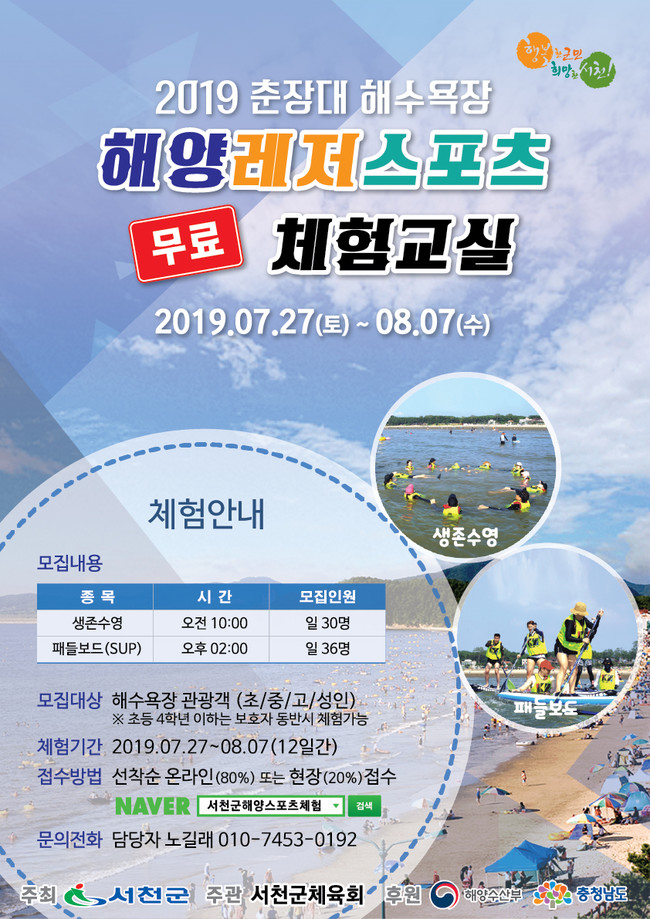 서천군에서 주관하고 서천군체육회가 주최하는 ‘제2회 2019 춘장대해수욕장 해양레저스포츠 무료체험교실’은 여름 휴가 기간을 맞아 해양레저스포츠를 즐기기에 천혜의 자연조건을 갖춘 춘장대해수욕장을 찾는 피서객들에게 ‘건강한 놀 거리와 볼거리 문화’를 알리고 무동력 해양레저스포츠의 즐거움을 제공하기 위해 마련됐다.