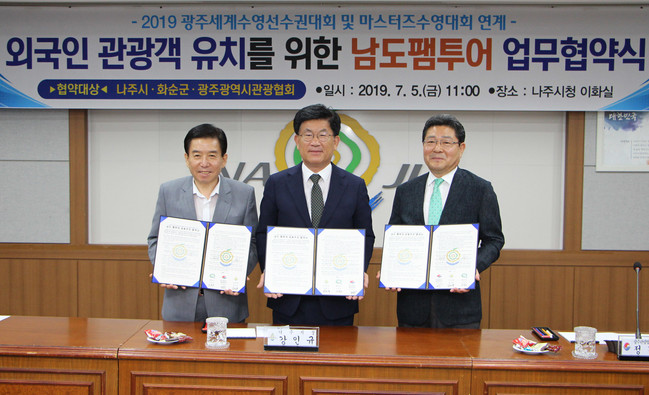 나주시는 지난 5일 시청 이화실에서 화순군, 광주시 관광협회와 ‘광주세계수영선수권대회 및 마스터즈 수영대회 외국인 관광객 유치를 위한 남도 팸투어 업무협약’을 체결했다고 8일 밝혔다.