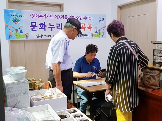 ‘찾아가는 수공예 문화상품 주문 서비스’는 거동이 불편하거나, 문화누리카드 가맹점을 찾기 어려운 주민들을 대상으로 문화누리카드 이용 기회 제공 및 이용활성화를 위해 진행됐으며, 이번 행사에서는 주로 예술가가 직접 만든 생활 도예품, 천연염색 생활한복, 죽공예품, 음원상품 등을 전시해 구매자가 직접 상품을 보고 주문할 수 있었다.