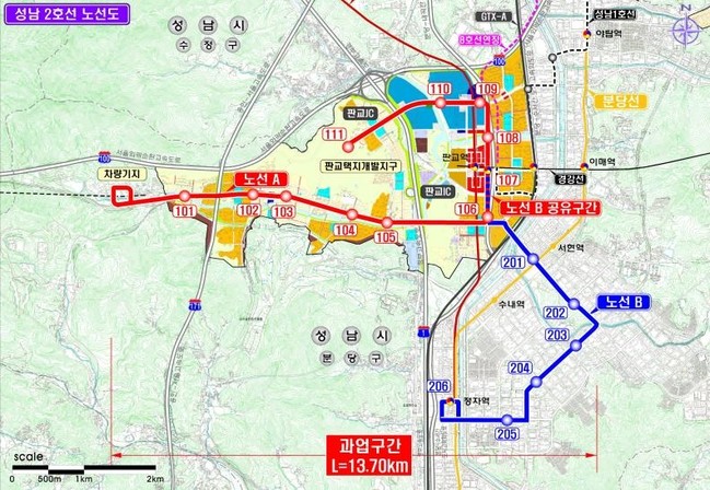 성남도시철도 2호선은 판교지구~판교테크노밸리~정자역, 운중동을 경유하는 노선으로 연장은 13.7km, 17개역, 차량기지 1개소 규모로 계획되었으며, 총사업비는 3,539억원 규모다. 향후 예비타당성조사, 기본계획 수립, 기본 및 실시설계 등을 거쳐 사업이 추진될 예정이다.