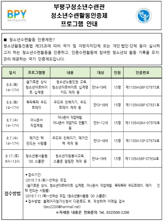 기타 자세한 사항은 수련관 홈페이지 공지사항을 참고하거나 부평구청소년수련관으로 문의하면 된다.