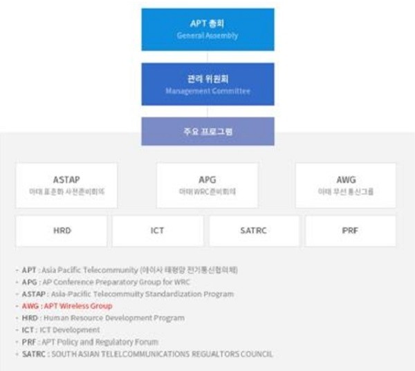 AWG는 아시아·태평양 전기통신협의체 산하 프로그램으로 아·태지역 국가 간 무선통신 기술 협력 및 효율적 주파수 이용 도모를 위해 우리나라의 제안으로 창설된 국제기구이다.