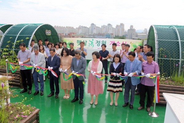 광주광역시서부교육지원청이 8일 직원들과 함께 옥상 생태휴식공간인 ‘햇살휴정원’ 개소식을 가졌다.