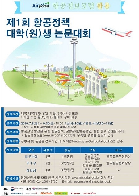 국토교통부는 우리나라 항공산업 발전을 위한 정책대안 발굴 및 항공산업 저변 확대 등을 위해 ‘제1회 항공정책 대학생 논문대회’ 논문을 8일부터 오는 9월 30일까지 공모한다고 밝혔다.