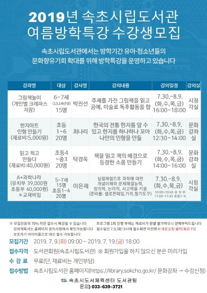 2019년 속초시립도서관 여름방학 특강 프로그램 수강생 모집 안내문