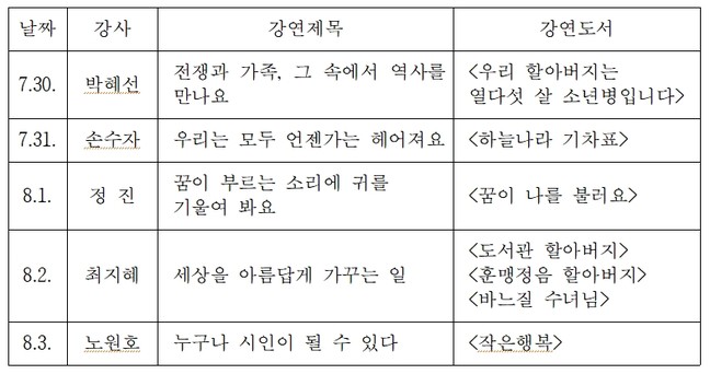 오는 30일 박혜선 강사의 ‘전쟁과 가족, 그 속에서 역사를 만나요’를 시작으로 8월 3일까지 매일 오전 10시, 총 5회에 걸쳐 진행된다.