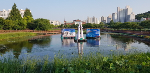 광주 서구가 운천호수에 2019광주세계수영선수권대회 성공 개최를 위한 광주 시민들의 염원을 담은 유등을 띄웠다.