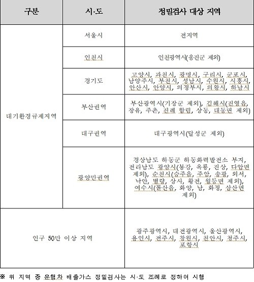 이와 함께, 최근 3년간 인구수가 50만명을 넘어선 경남 김해시, 경기 화성시에 자동차를 등록한 소유자는 오는 2020년 1월 1일부터 운행차 배출가스 정밀검사를 받게 된다.