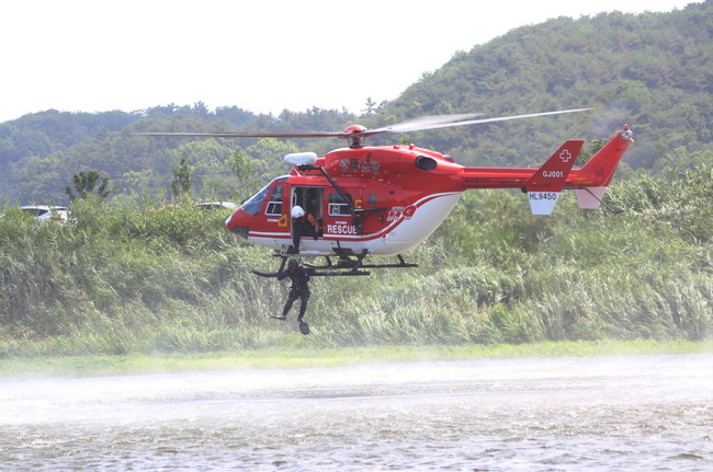 특히, 유원지 수상레저기구가 전복돼 물에 휩쓸려 떠내려가는 다수의 익수자가 발생한 상황을 가정해 항공대원과 지상 구조대원 합동으로 소방헬기와 구조보트를 이용, 익수자를 신속히 안전하게 구조하는데 중점을 두고 진행했다.