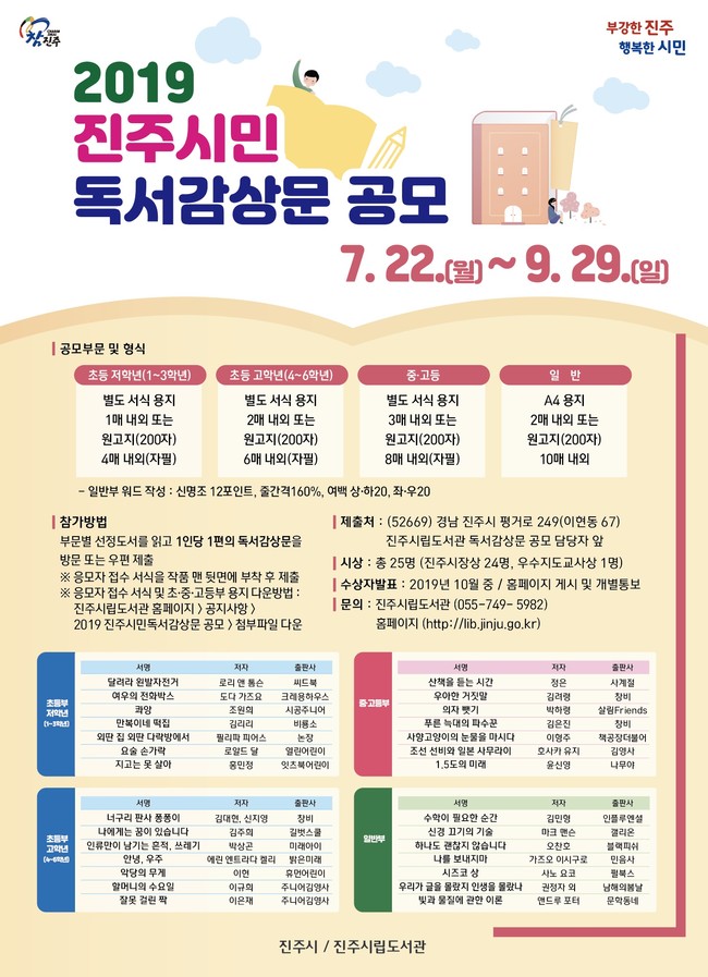 초등학생 이상 진주시민이 대상이며 초등부, 중·고등부, 일반부 총 3개 부문으로 공모한다.응모방법은 부문별 선정도서 중 한 권을 읽고 200자 원고지 기준으로 초등부 4 ~ 6매, 중·고등부 8매, 일반부 10매 내외의 분량으로 작성해 제출하면 된다.