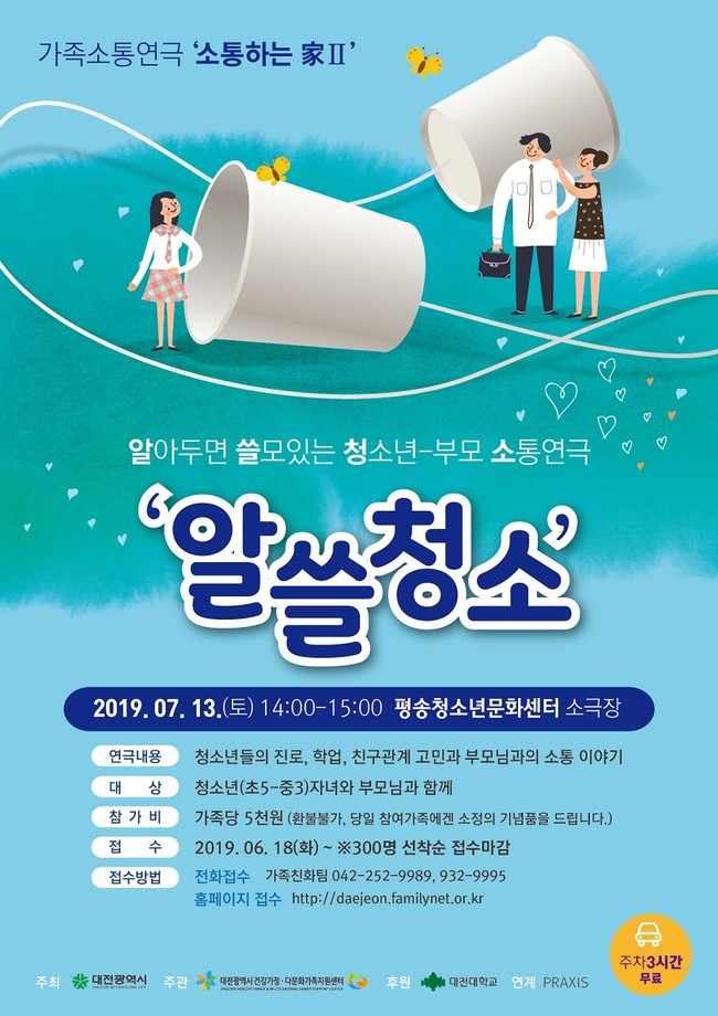 가족소통연극‘소통하는 家Ⅱ-알쓸청소’는 대전시 거주 청소년 가족을 대상으로 하며 참가비는 가족 당 5,000원이다. 당일 참여 가족에겐 소정의 기념품이 지급된다.
